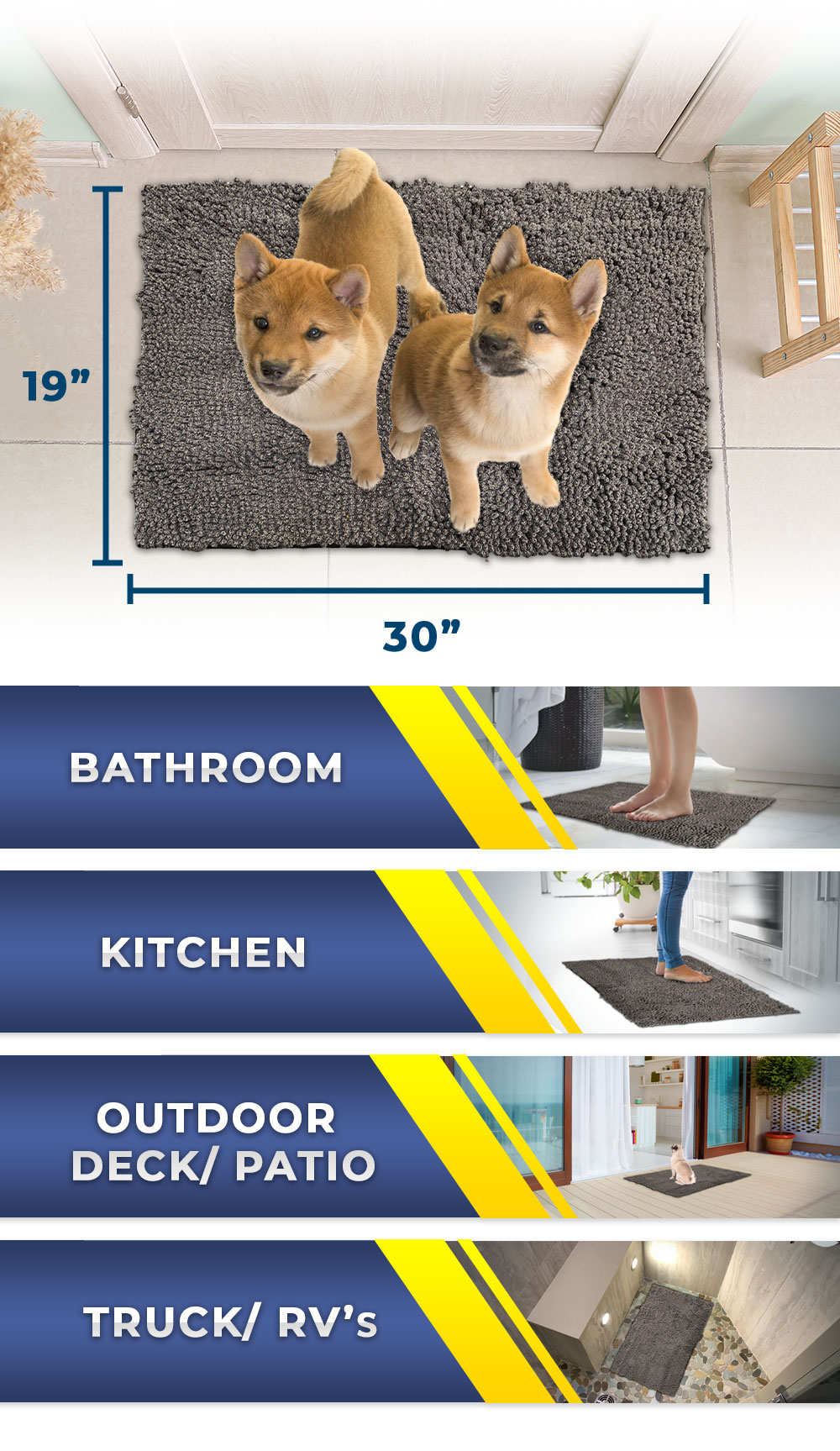 I originally bought this to make bath time clean up much easier, but my dog loves this way too much to keep it only for the bath! I bought 2 more, 1 for wiping him dry paws after a day out in the rain, or if there’s too much slobber from drooling on the ball (haha). He loves it so much, all I need to do is say “Time to dry your feet!” and he fetches his favorite towel for me. I saw that Muddy Mat also sells these rugs made of the same material, so I had to buy one for each of the doggy doors!